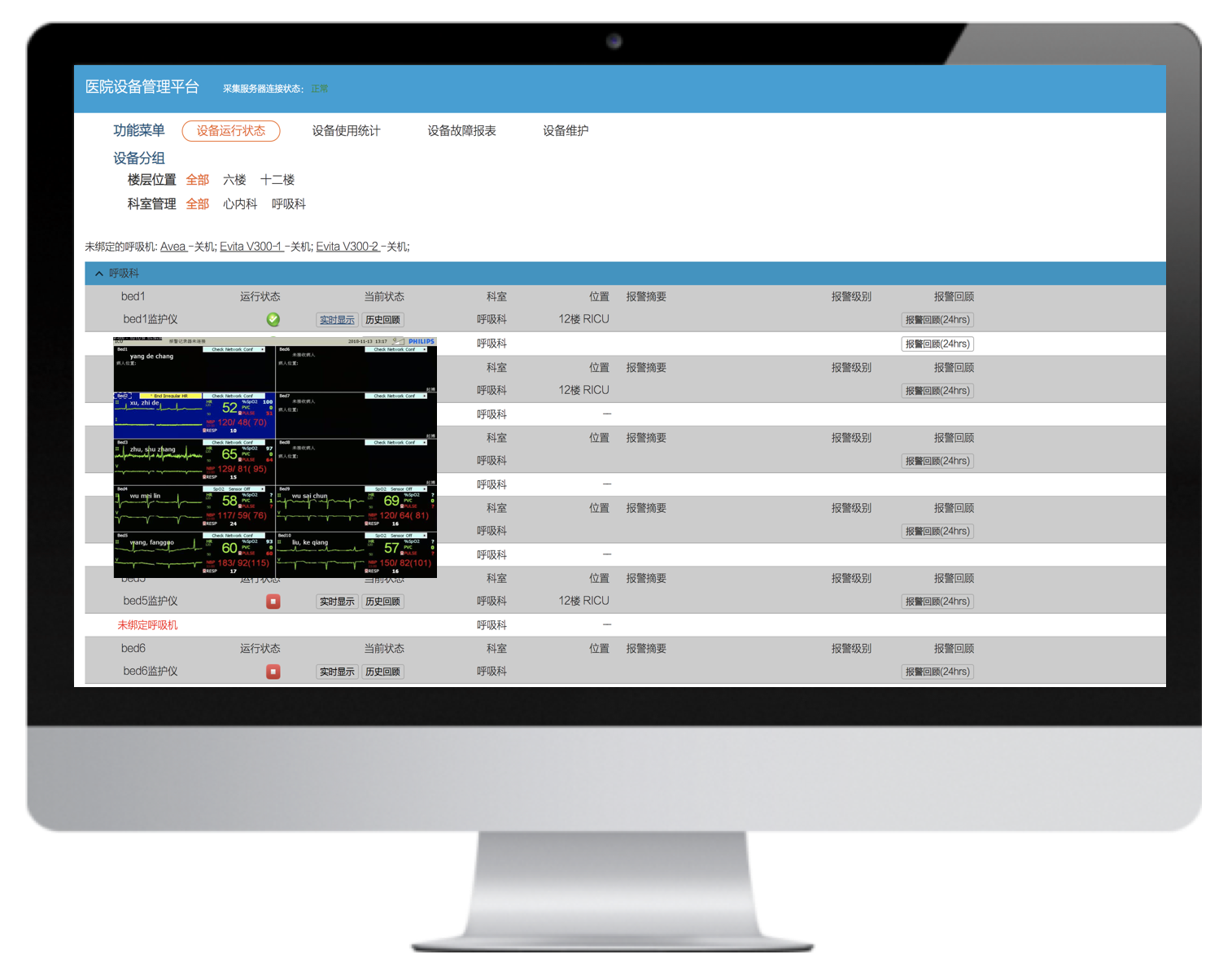 病床綁定、患者體征實(shí)時(shí)監(jiān)護(hù)、精確告警、告警響應(yīng)處置等